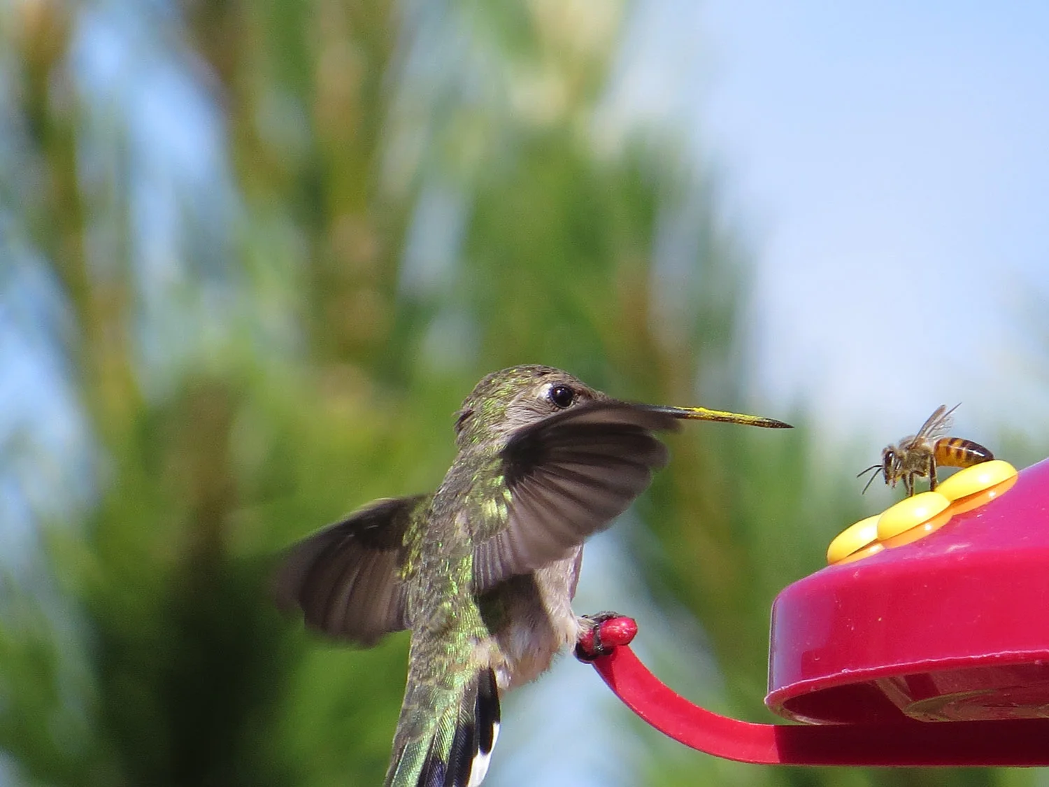 Female black-chinned hummingbird vs. bee, Camp Verde, Arizona, May 2, 2016