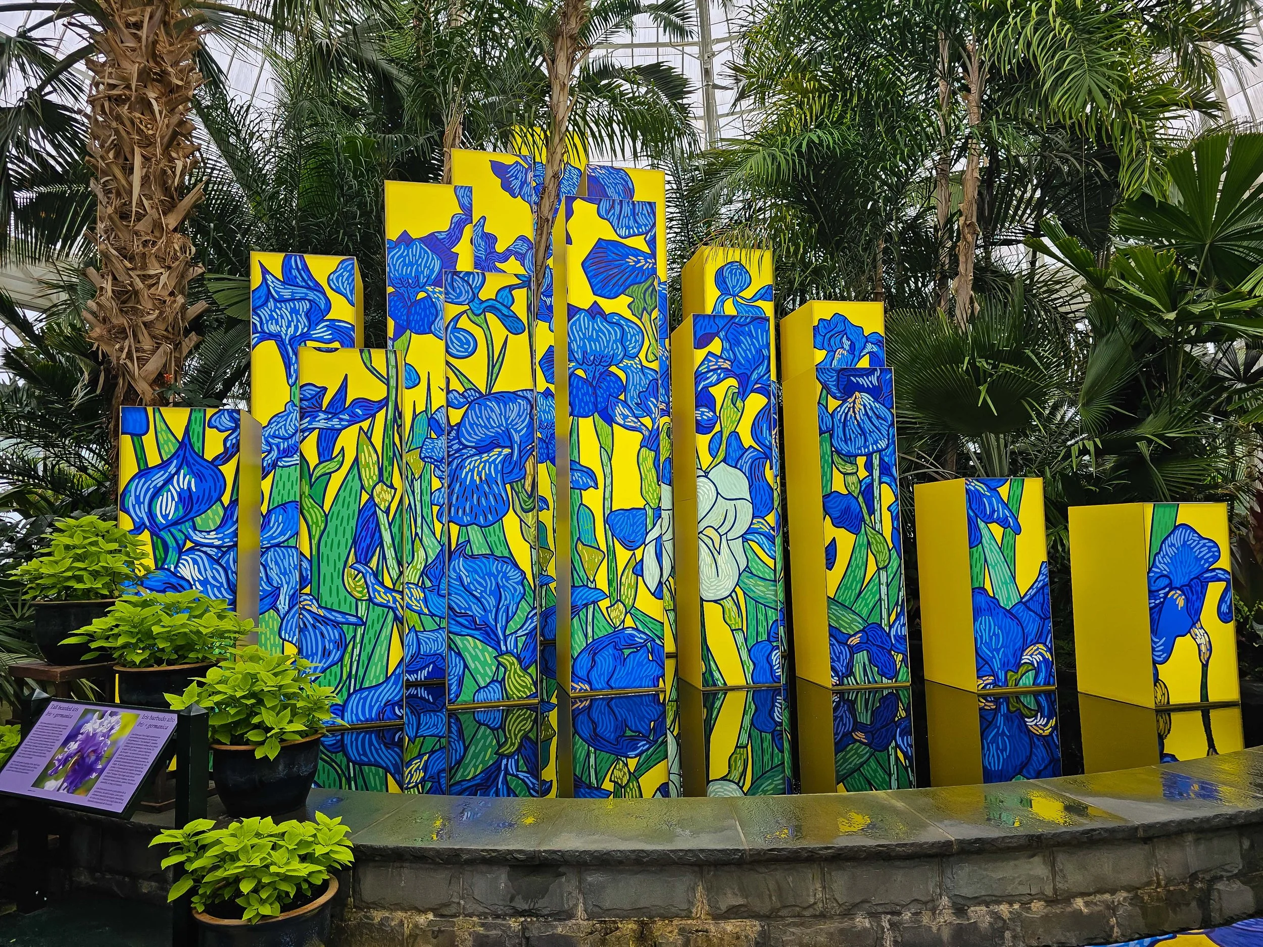 The first display in the Enid Haupt Conservatory is Irises On Yellow Columns by Graphic Rewilding. This sculpture is beautifully reflected in the pool (although I was not impressed by the vinyl decals on the floor, which I found static and uninviting).