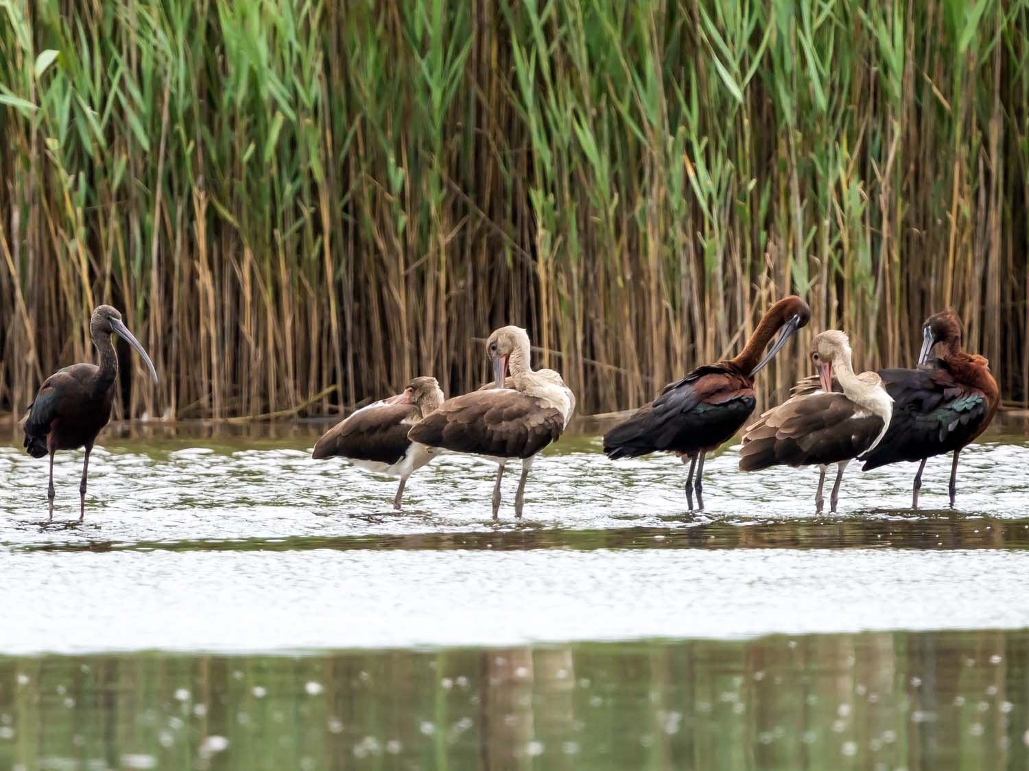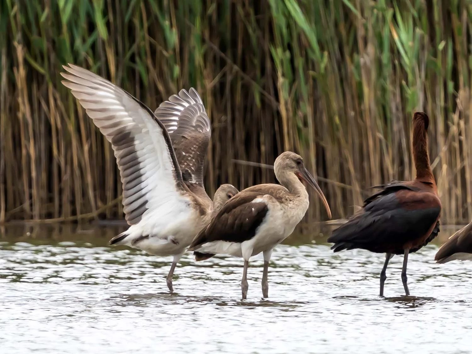 Glossy ibises and young white ibises, Delwit Avenue, Staten Island, August 1, 2025